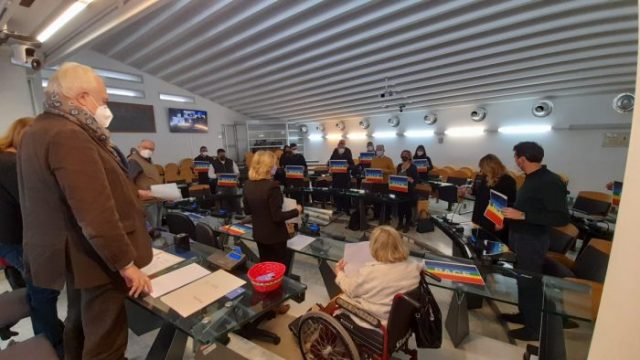 Noi respingiamo con fermezza ogni forma di violenza e di guerra. Per questo nella seduta odierna di Consiglio abbiamo voluto esibire bandiere della pace e cartelloni con scritto #stopwar.