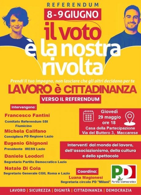 Interverranno Francesco Fantini, comitato referendum 5SI Fiumicino. Michela Califano, per cui, consigliera