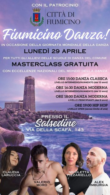 Il 29 aprile (oggi, ndr), in occasione della “Giornata Mondiale della danza”, istituita per celebrare il ballo come forma d’arte universale e promuovere la sua diversità culturale, su impulso dell’Assessore allo Sport ed alla cultura, Federica Poggio, l’Amministrazione di Fiumicino offrirà agli allievi delle scuole di danza di tutto il territorio comunale la possibilità di partecipare gratuitamente ad una masterclass tenuta da docenti di fama nazionale.