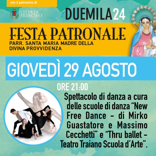I festeggiamenti civili avranno inizio giovedi 29 agosto alle ore 21:00 con lo spettacolo di danza a cura delle scuole “New Free Dance” di Mirko Guastatore e Massimo Cecchetti, “Thru ballet” e “Teatro Traiano Scuola d’arte”.