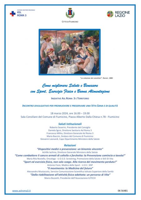 “Come migliorare Salute e Benessere con sport esercizio fisico e buona alimentazione.” Questo il focus dell’incontro divulgativo per preservare una vita sana e di qualità, che si terrà lunedì 18 marzo dalle16 alle19, presso l’Aula Consiliare del Comune di Fiumicino.