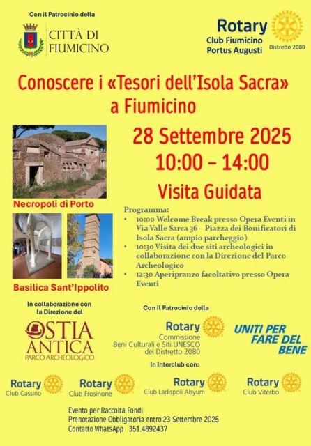 La visita guidata ai Tesori dell’Isola Sacra, promossa dal Rotary Club Fiumicino Portus Augusti con il patrocinio della Città di Fiumicino, della Commissione Cultura e Siti UNESCO del Rotary Distretto 2080 e in collaborazione con la Direzione del Parco Archeologico di Ostia Antica,
