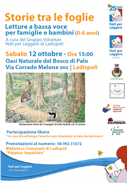 Sabato 12 ottobre torna un nuovo appuntamento di Nati per leggere: le letture a bassa voce per bambini da 0 a 6 anni, organizzato dalla biblioteca Peppino Impastato e a cura del Gruppo Volontari Nati per Leggere di Ladispoli.