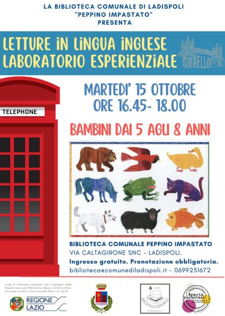 Martedì 15 ottobre alle ore 16:45 si terrà nella Biblioteca “Peppino Impastato” il Laboratorio esperienziale con letture in lingua inglese, dedicato a tutti i curiosi dai 5 agli 8 anni.