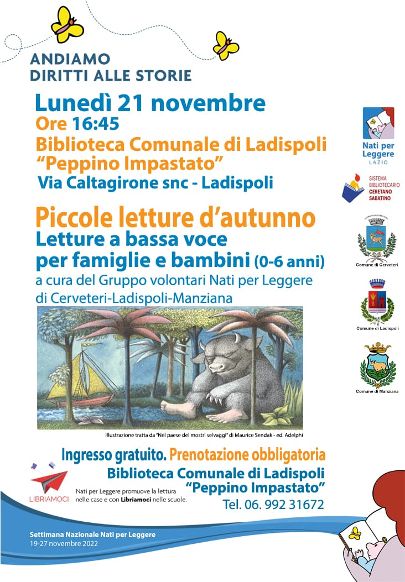 L’amministrazione comunale informa che la Biblioteca, grazie al sostegno del Gruppo volontari Nati per Leggere di Cerveteri, Ladispoli e Manziana, prosegue le Piccole letture d’autunno con l’appuntamento Il mondo delle parole, lettura a bassa voce per famiglie e bambini, previsto alle ore 16.45 di lunedì 21 novembre, in compagnia di Loredana Simonetti.