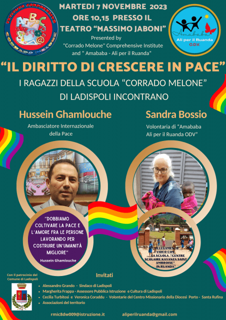 Martedì 7 Novembre i ragazzi della “Corrado Melone” incontreranno, presso il teatro della scuola, l’Ambasciatore Internazionale della Pace Hussein Ghamlouche e Sandra Bossio, volontaria in Ruanda dell’Associazione Amababa – Ali per il Ruanda e direttrice della biblioteca comunitaria “Le Phare”.