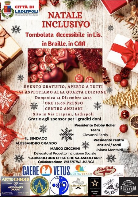 Domenica 14 dicembre 2025, a partire dalle ore 16:00, presso il Centro Anziani di via Trapani, si terrà la quarta edizione del “Natale Inclusivo – Tombola Accessibile”, un evento gratuito, aperto a tutta la cittadinanza.