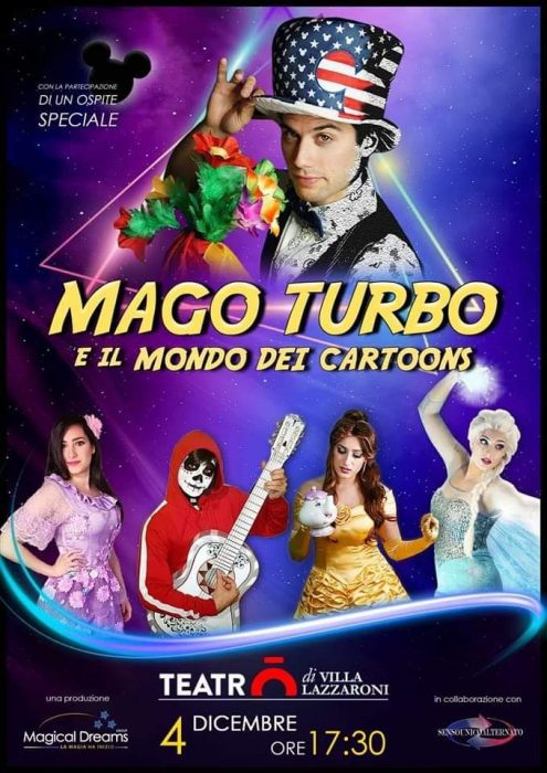 Sarà in scena domenica 4 dicembre al Teatro di Villa Lazzaroni lo spettacolo MAGO TURBO e il mondo dei Cartoons con Umberto Vita, Daniele Vita e Giuliana Di Dio. Una produzione MAGICAL DREAMS GROUP in collaborazione con SENSO UNICO ALTERNATO.