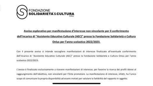 In realtà controllando ancora abbiamo trovato un avviso di manifestazione di interesse, non vincolante, da parte di Fondazione Solidarietà e Cultura pubblicato il 29 agosto con scadenza 5 settembre 2022