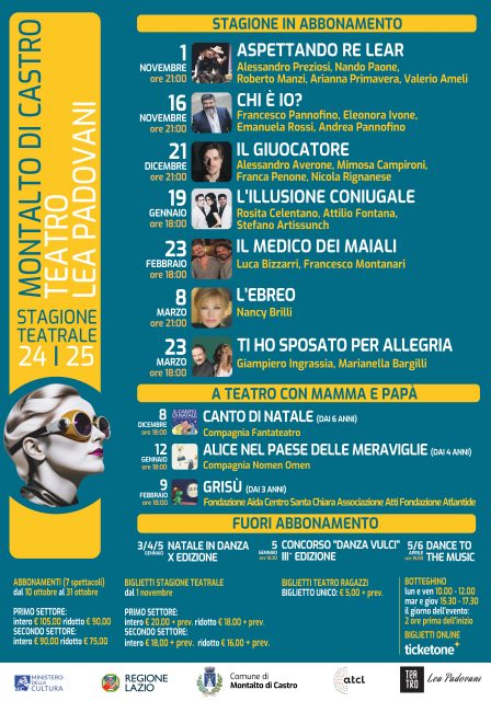 Il cartellone, frutto della collaborazione tra il Comune di Montalto di Castro e l’Associazione Teatrale tra i Comuni del Lazio (ATCL), sotto l’egida del Mic e della Regione Lazio, vedrà sul palco interpreti di spicco del panorama teatrale italiano.