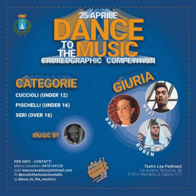Lunedì 25 aprile, sempre dalle ore 15:00, al via il vero e proprio “Dance to the music”: una gara coreografica dove diversi gruppi provenienti da tutta Italia presenteranno le loro coreografie per aggiudicarsi la vittoria finale.