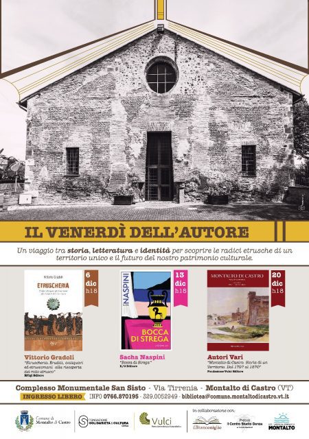 L’organizzazione della rassegna “Il Venerdì dell’Autore” è resa possibile grazie al sostegno del Comune di Montalto di Castro, della Fondazione Solidarietà e Cultura e della Fondazione Vulci, con la collaborazione della Libreria Il Bianconiglio, lo Studio Danza e l’associazione TCM.