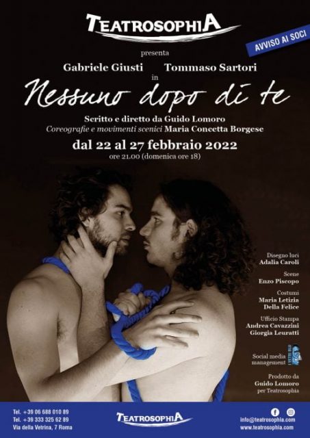 Debutta in prima assoluta al Teatrosophia dal 22 al 27 febbraio ” Nessuno dopo di te”, con la regia del direttore artistico Guido Lomoro che per la prima volta mette in scena un suo testo. I due protagonisti sono interpretati da Gabriele Giusti e Tommaso Sartori: due giovani attori di grande talento diplomatisi il primo all’Accademia teatrale di Roma Sofia Amendolea e il secondo, alla Scuola di Teatro di Bologna Alessandra Galante Garrone.