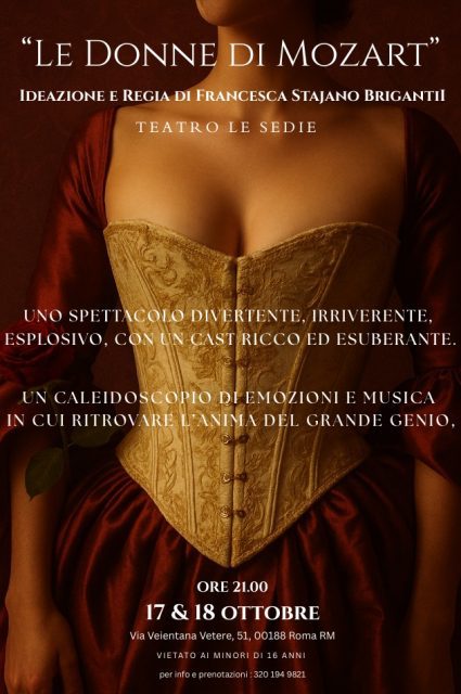 Le Donne di Mozart andrà in scena il 17 e 18 ottobre al Teatro Le Sedie, in Via Veientana Vetere 51, Roma. Le serate sono quasi sold out, segno che il pubblico ha voglia di emozione vera, di storie sincere, di arte che sa ancora toccare il cuore.