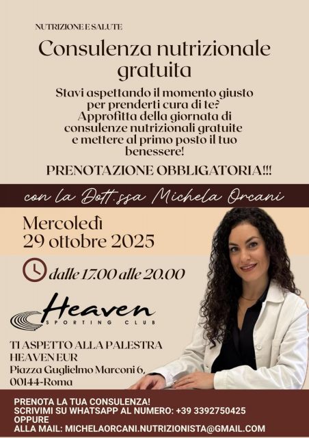 La Dott.ssa Orcani sarà disponibile mercoledì 29 ottobre 2025, dalle 17:00 alle 20:00, presso lo Heaven Sporting Club EUR, in Piazza Guglielmo Marconi 6, Roma, per una sessione gratuita di consulenze nutrizionali. Info in volantino