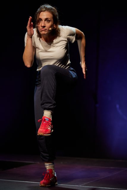 Tanto che buona parte del racconto si dipana mentre l’attrice/atleta corre regalando allo spettacolo ritmo