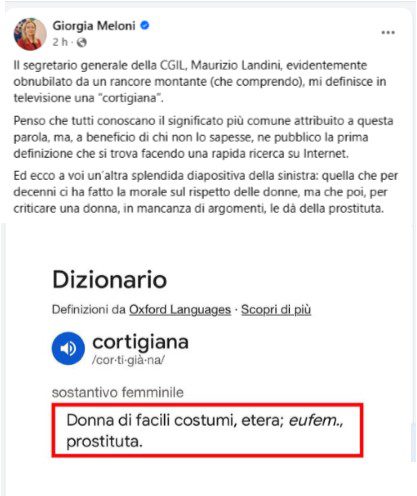 “Il segretario generale della Cgil, Maurizio Landini, evidentemente obnubilato da un rancore montante (che comprendo), mi definisce in televisione una cortigiana”, scrive la premier.