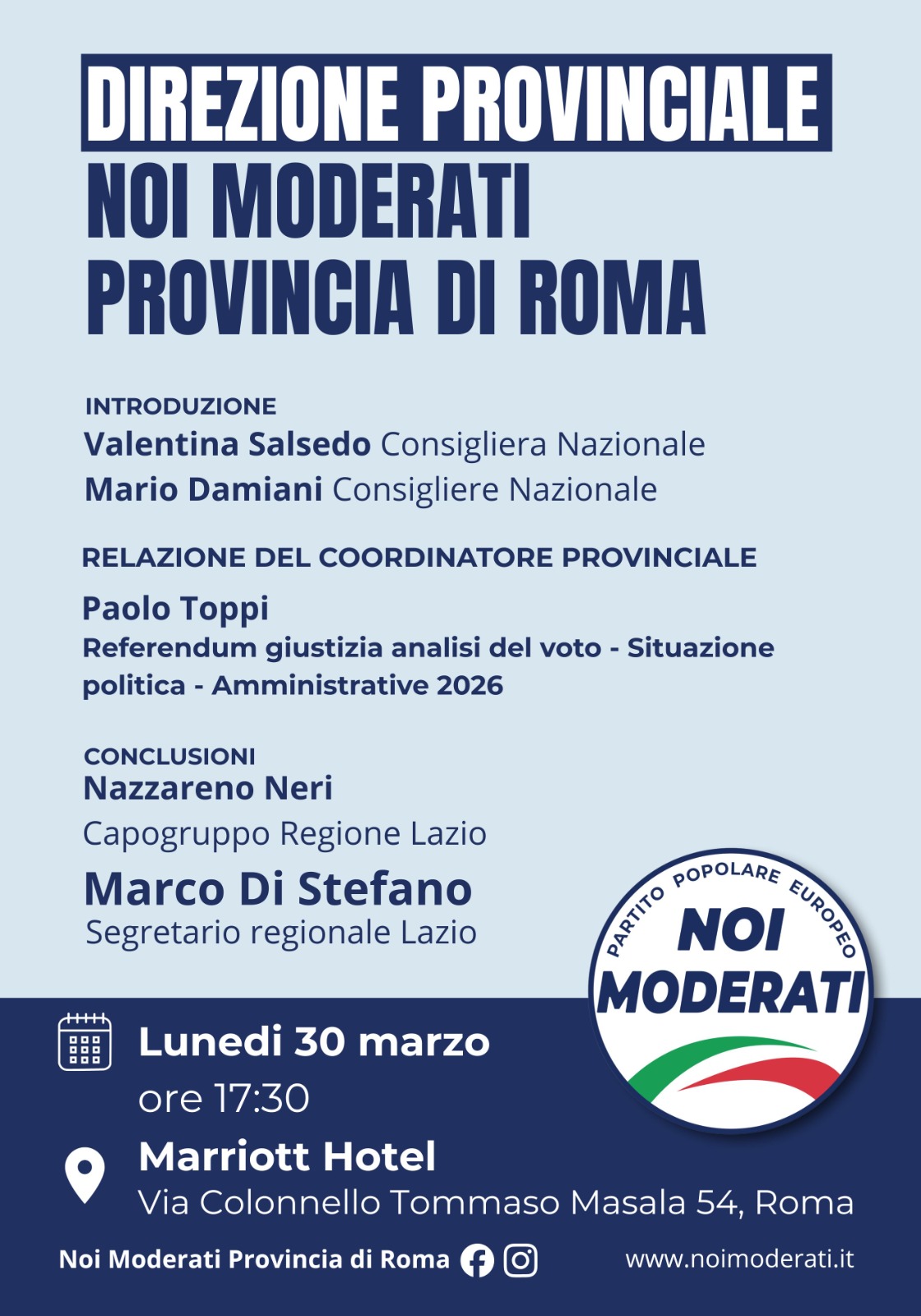 Si tiene oggi, lunedì 30 marzo, a Roma la Direzione Provinciale di Noi Moderati della provincia capitolina, un appuntamento politico atteso che riunisce dirigenti, amministratori e rappresentanti del partito per fare il punto sulla fase politica e sulle prossime sfide elettorali.