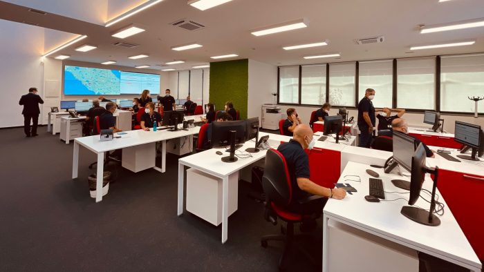 Le due pareti laterali sono dotate di mega schermi. Adiacente alla sala operativa è stato realizzato un ulteriore spazio divisibile in due che può essere utilizzato come centro di formazione o, all’occorrenza, come emergency room all’interno della quale, in caso di eventi straordinari, tutta la linea di comando dell’esercizio può riunirsi per assumere le decisioni necessarie.