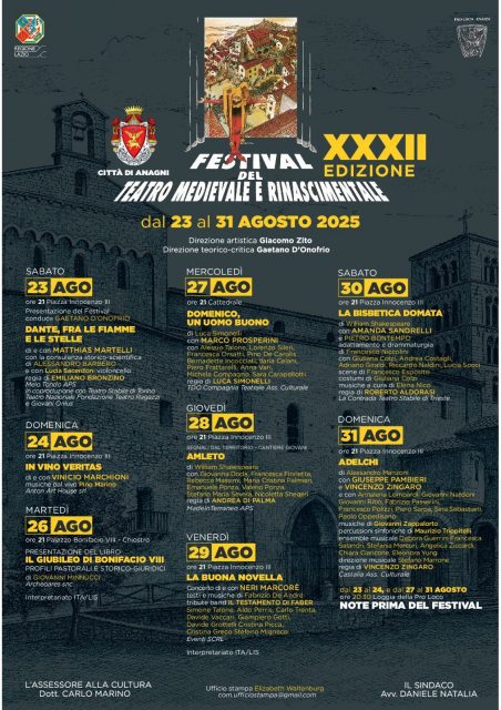 Torna dal 23 al 31 agosto il Festival del Teatro Medievale e Rinascimentale di Anagni, giunto alla sua XXXII edizione.