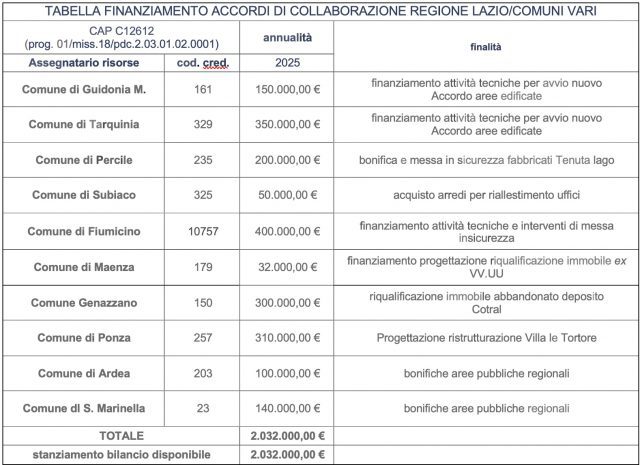 I fondi raggiungono i Comuni di Guidonia, Tarquinia, Percile, Subiaco, Fiumicino, Maenza, Genazzano, Ponza, Ardea e Santa Marinella, che potranno completare accordi già avviati oppure attivarne di nuovi.