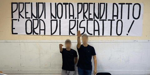 Di poco fa la notizia di studenti, candidati alla rappresentanza studentesca in Consiglio d’Istituto al Liceo Montessori di Roma nella lista «riscatto», fotografati in una classe mentre facevano un saluto romano di fronte ad uno striscione che recitava «Prendi nota prendi atto, è ora di riscatto!»