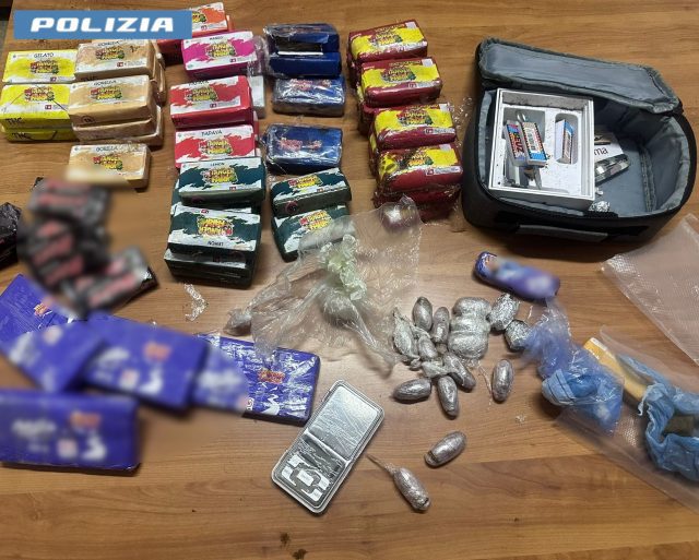 La perquisizione del box ha permesso di rinvenire 40 grammi di cocaina e oltre 6 kg di hashish suddivisi in panetti riportanti il logo di noti marchi di cioccolata.