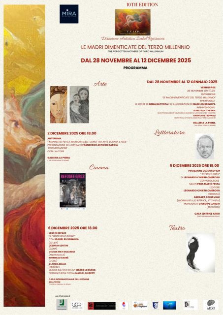L’iniziativa, presentata da Fondazione Mira e diretta da Isabel Russinova, quest’anno è incentrata sul tema “Le madri dimenticate del terzo millennio”, un omaggio alle donne che affrontano guerre, miserie e discriminazioni senza perdere la forza di resistere e costruire futuro.
