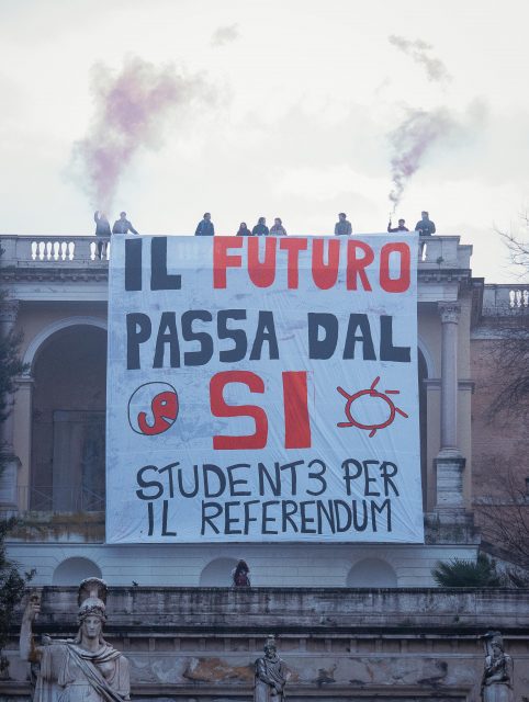 “IL FUTURO PASSA DAL Sì”, si legge sullo striscione.
