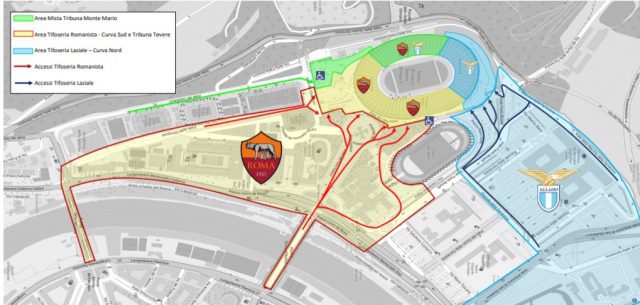 In attesa di definire le misure di sicurezza del derby capitolino nel tavolo tecnico che sarà presieduto domani pomeriggio dal Questore di Roma, è stata definita la modalità di afflusso come da piantina meglio di seguito raffigurata.