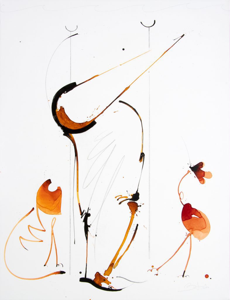 Lo stile di Bato si caratterizza per la sua capacità di non rinunciare alla forma ma trasformarla in segno, un segno rapido, incisivo ed elegante, steso su vaste campiture bianche. Animali, paesaggi, avvenimenti e ricordi di viaggio sono le fonti d’ispirazione a cui attinge per creare le sue composizioni. Nonostante il senso di apparente immediatezza che le tele comunicano, il processo creativo di Bato prevede elaborati studi, schizzi e bozze, che gli permettono di creare una composizione equilibrata e armonica nella sua essenzialità, come se si trattasse di un’improvvisazione calcolata che non lascia spazio a ripensamenti.