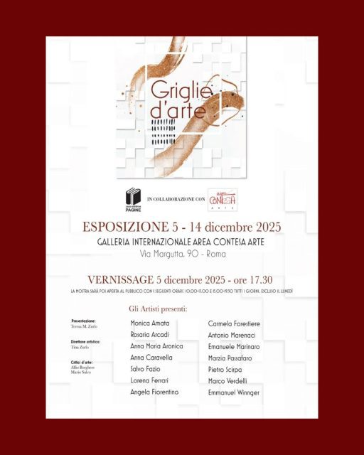 Alle 18:30, nella Sala Botero, prende forma la mostra collettiva Griglie d’Arte, curata dalla casa editrice Pagine: un mosaico di opere che mantengono la voce individuale ma dialogano in un impianto corale, coerente, mai scontato.