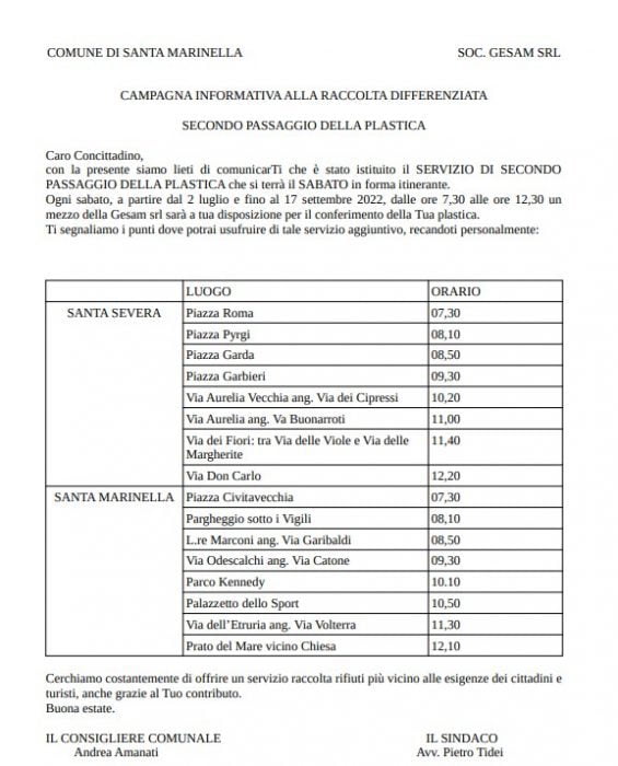 Il comune informa che è stato istituito il secondo passaggio per la raccolta della plastica. Ogni sabato a partire dal 2 luglio e fino al 17 settembre dalle 7:30 alle 12:30. La raccolta sarà itinerante e dovrà essere recapitata personalmente nel punto di ritiro sopra elencato.