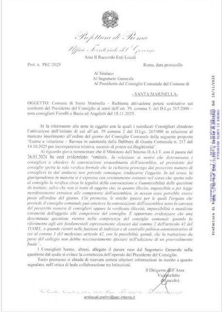 Con una lettera indirizzata al Prefetto di Roma, dott. Giannini, Angeletti chiede chiarimenti in merito al significato del parere reso dalla Prefettura in data 18 novembre 2025, a seguito della sua precedente istanza di intervento sostitutivo ex art. 39, comma 5, TUEL.