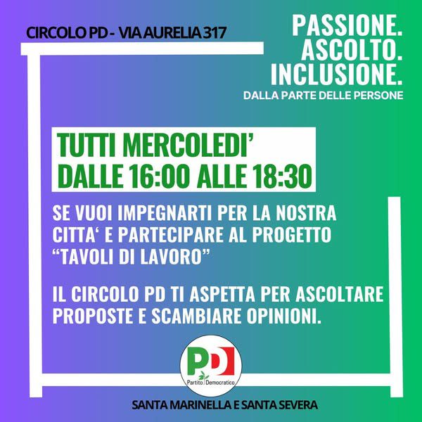 TUTTI I MERCOLEDÌ dalle 16:00 alle 18:30, al Circolo PD in Via Aurelia 317 (alle spalle della storica pizzeria di “Gino”).