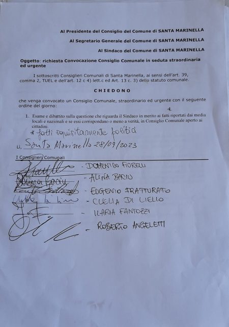 Posto che il nostro capogruppo Domenico Fiorelli si è fortemente opposto a questa eventuale decisione in quanto lesiva del diritto dei cittadini santamarinellesi a conoscere la verità dei fatti, allego sotto la nostra richiesta, sottolineandone la frase ‘fatti squisitamente politici’.