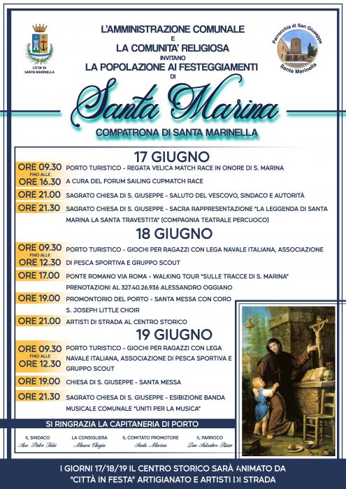 In serata alle ore 21 sul sagrato della Chiesa di San Giuseppe il saluto del Sindaco Tidei e del Vescovo a seguire una rappresentazione teatrale a cura della ormai famosa compagnia Percuoco che narrerà la storia di Santa Marina tra verità e leggenda.
