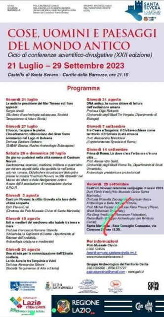 Si illustrerà la ricerca in corso e il progetto di valorizzazione per la creazione del “Parco Archeologico di Castrum Novum” a cura dell’amministrazione comunale di Santa Marinella, tramite il Polo Museale Civico, con la supervisione della Soprintendenza, in collaborazione con l’università di Pilsen, l’istituto Finlandese di Roma e il Gruppo Archeologico del Territorio Cerite.