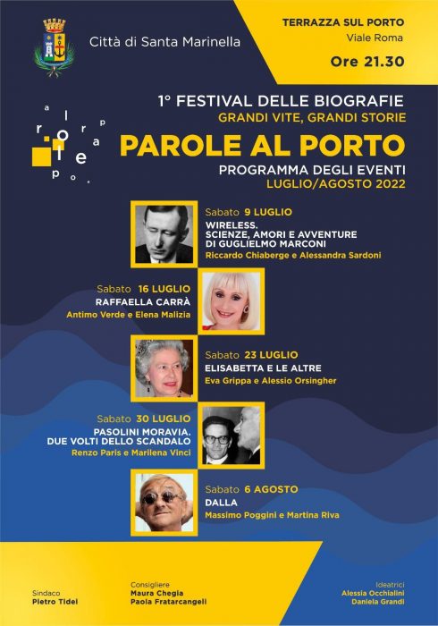 “Parole al porto. Grandi vite, grandi storie” questo il titolo scelto per l’interessante manifestazione che sarà ospitata il sabato sera sulla suggestiva terrazza del Porto di Santa Marinella, ideata da Daniela Grandi e Alessia Occhialini, con la collaborazione del Comune di Santa Marinella, del Sindaco Pietro Tidei e delle Consigliere Maura Chegia e Paola Fratarcangeli