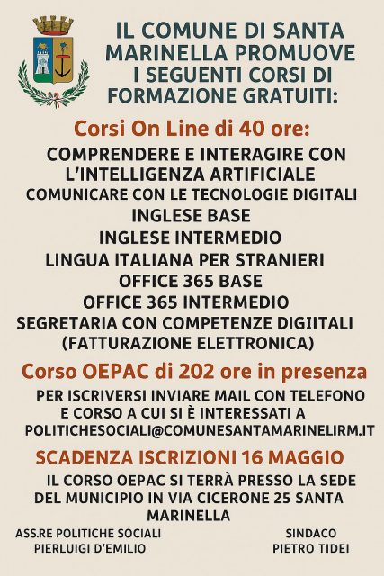 Il Comune di Santa Marinella, attraverso l’Assessore ai Servizi Sociali Pierluigi D’Emilio, annuncia l’apertura delle iscrizioni a nuovi corsi online e a un corso OEPAC in presenza, nell’ambito del progetto GOL per la riqualificazione professionale.