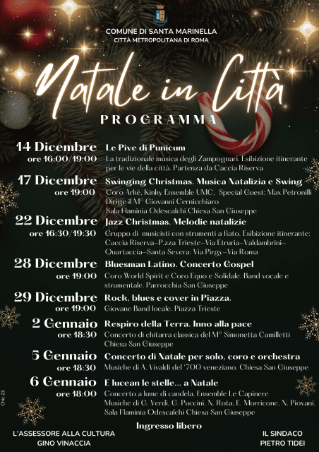 Chiuderemo il programma il 6 gennaio, alle ore 18 con il concerto a lume di candela, “E lucean le stelle…a Natale”, a cura di Ensemble Le Capinere, che eseguiranno musiche di Verdi, Puccini, Rota, Morricone e Piovani, presso la Sala Flaminia Odescalchi ”.