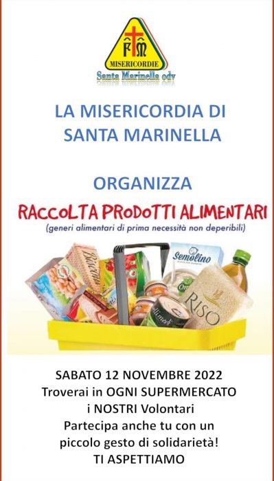 Un piccolo gesto di solidarietà che può fare la differenza e aiutare chi è in difficoltà. Quanti vorranno contribuire ad aiutare tante persone e famiglie, che stanno vivendo una situazione di disagio economico, potranno farlo con un acquisto di beni di prima necessità, e prendere parte alla giornata di raccolta alimentare promossa dalla Misericordia di Santa Marinella, che si svolgerà sabato prossimo 12 novembre per l’intera giornata.