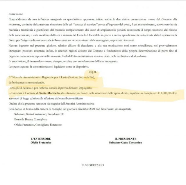 Ebbene il 5 gennaio il TAR Lazio si è pronunciato ed ha accolto il ricorso presentato dalla citata Società contro il Comune che aveva dichiarato decaduta la concessione, condannando l’ente al pagamento delle spese.