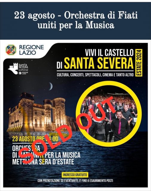 <<Tutto esaurito per l evento METTI UNA NOTTE D’ ESTATE dell’orchestra di fiati “ Uniti per la Musica” città di Santa Marinella. È dall’anno 2020 che l’orchestra della Perla si esibisce sul prestigioso palcoscenico delle notti al castello di Santa Severa.