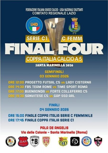 Oggi, sabato 4 gennaio, il Palazzetto dello Sport Pala De Angelis di Santa Marinella ospiterà la finale della Coppa Italia Serie C femminile e maschile, atto conclusivo della Final Four organizzata dal Comitato Regionale Lazio della LND.