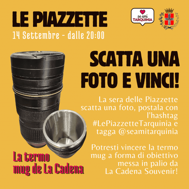 Arriva il contest fotografico a Le Piazzette! Partecipare sarà gratuito e semplicissimo: basterà godersi le Piazzette, scatenarsi e divertirsi tra locali, buon cibo, aperitivi, shopping, balli e musica; le foto della serata andranno postate su Instagram con l’hashtag #LePiazzetteTarquinia e taggando il profilo @seamitarquinia.