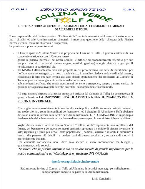Infatti, il responsabile della struttura, Livio Cenciarini, ha pubblicato nei giorni scorsi una lettera sulla mancata apertura del servizio piscina del Centro sportivo.