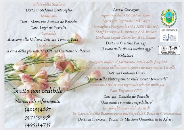 TOLFA – Importante convegno “Sanità è donna” venerdì 14 aprile alle 17:00, presso il Polo Culturale, promosso dall’Assessorato alla Cultura del Comune di Tolfa e la locale Fidapa con il patrocinio dell’OMCeO Roma (Ordine Medici-Chirurghi e degli Odontoiatri della Provincia).