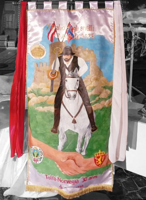 Il tema del drappo 2025, realizzato dall’artista Valentina Mariani, celebra i trent’anni di amicizia Tolfa–Norvegia, legame nato nel 1995 con la fondazione del Centro Studi Italo-Norvegese.