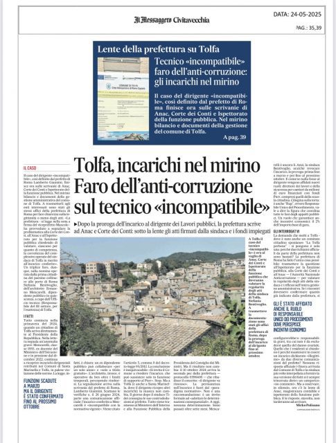 <<Quanto emerge in queste ore dalla stampa, in merito alla presunta incompatibilità del dirigente ai Lavori Pubblici del Comune di Tolfa, trasmessa dalla Prefettura ad ANAC, Corte dei Conti e Ispettorato della Funzione Pubblica,